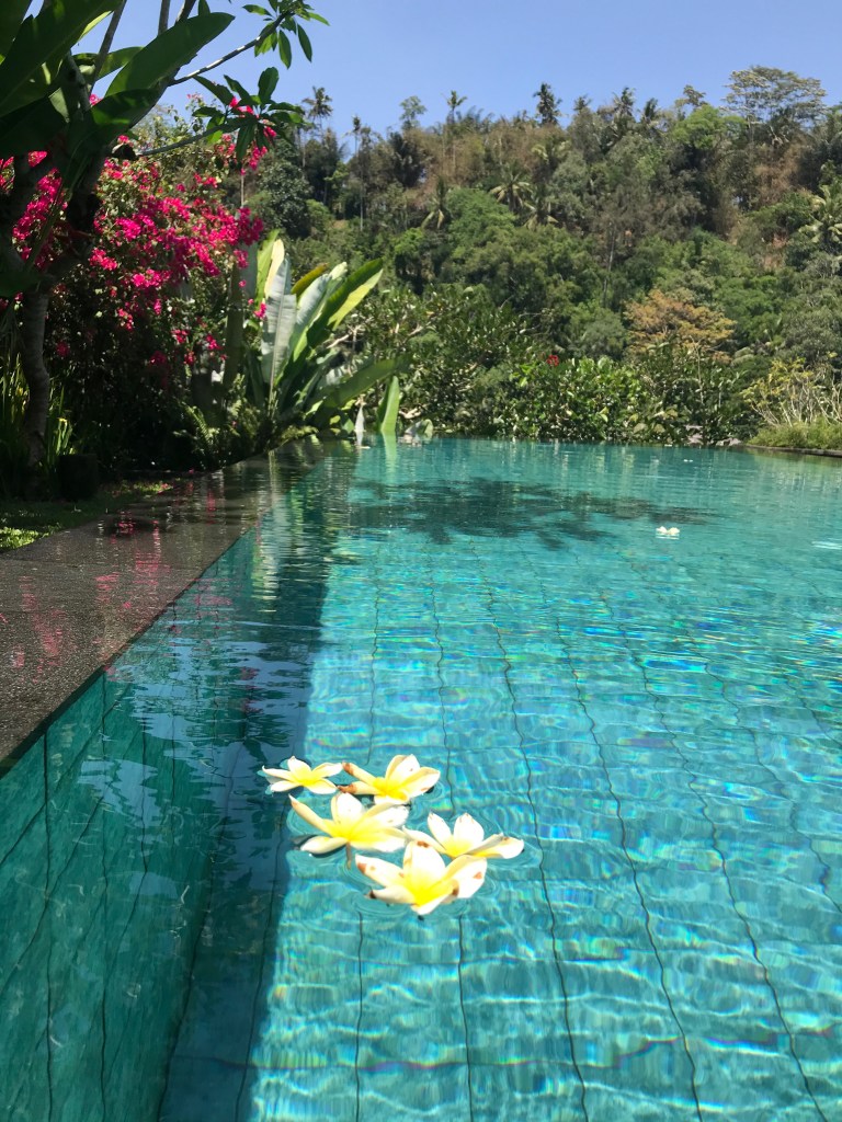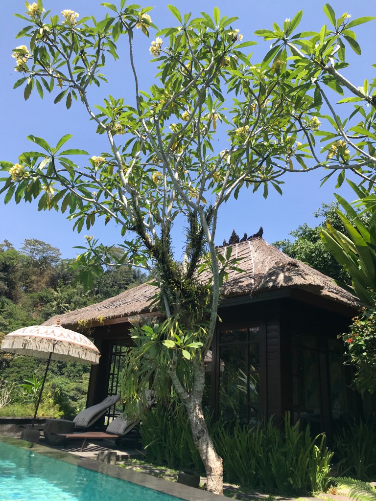 Our morning started with a dip in the pool before breakfast. We’re enjoying taking a morning, afternoon and evening dip in the pool between our activities. The pool is surrounded by beautiful tropical flowers and looks out over a lush jungle paradise and is splattered with Frangipani flowers that have fallen from the trees overnight. It’s so pleasant to swim in a “floral arrangement.”