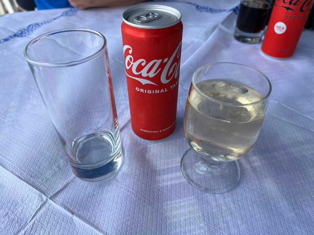 As we walked along the paths through the shops and businesses, we stopped for refreshment at a little café along the waterfront…..the ever famous Greek Ouzo (licorice-flavored liquor) and a glass of White Greek wine, and perhaps a little taste of the states, Coca Cola!