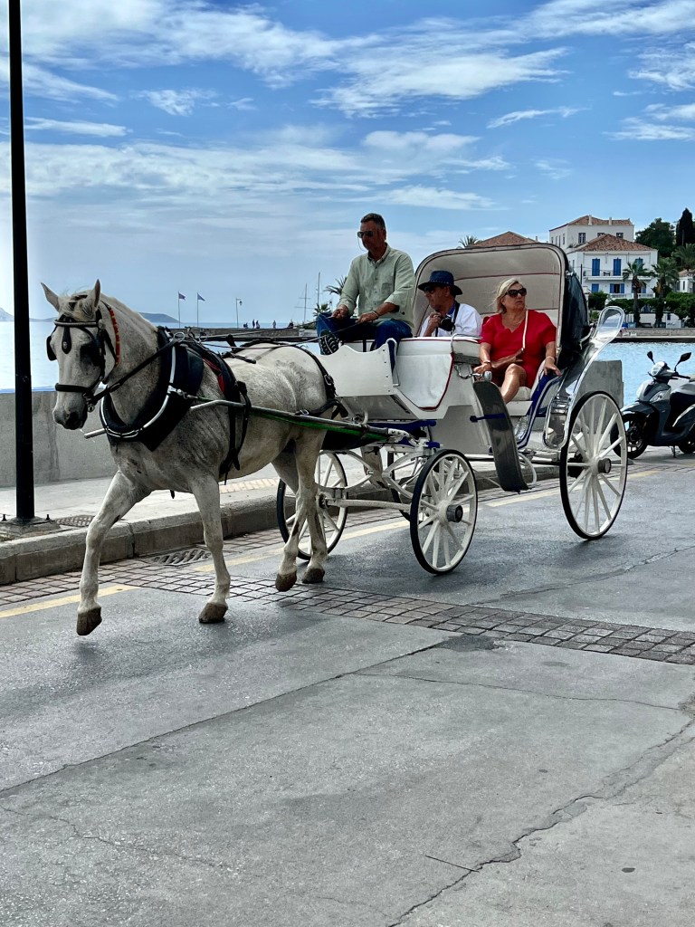 An unusual aspect of Spetsai is that no private automobiles are allowed within the town limits which is lovely except that the motorcycles are annoyingly noisy and far too numerous! Other modes of transport are walking, horse-drawn carriages, bicycles and mopeds. Ferries and high-speed hydrofoils arrive regularly from the Athenian port of Piraeus.