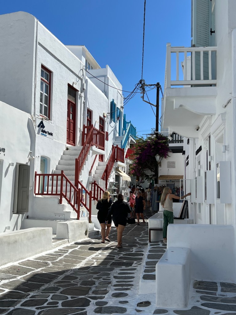 One of the best ways to discover the charm of Mykonos Town is on foot so we set off from the harbor to explore the town of Hóra. In an attempt to foil the attacking pirates of yesteryear the town’s narrow winding streets (lined with whitewashed houses and walled gardens) have a deliberately confusing layout, somewhat like the streets of Atlanta! All doorways face towards the back and away from the sea front and the strong winds.
