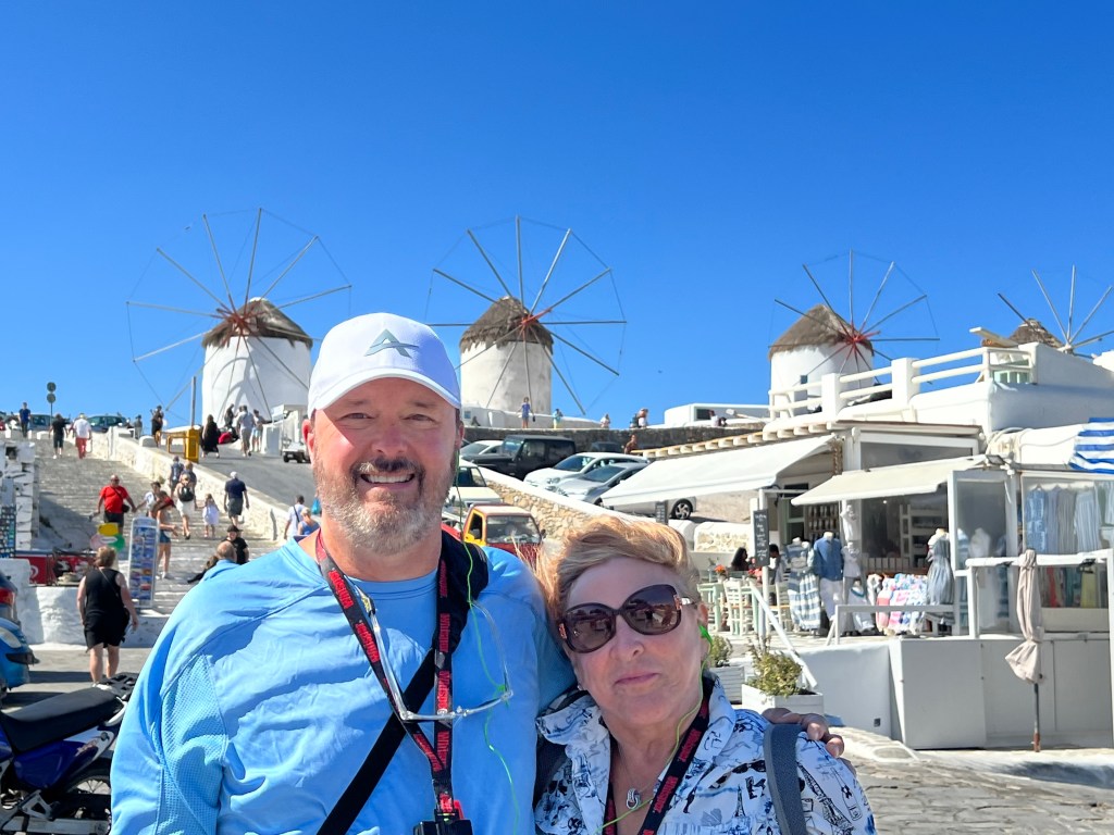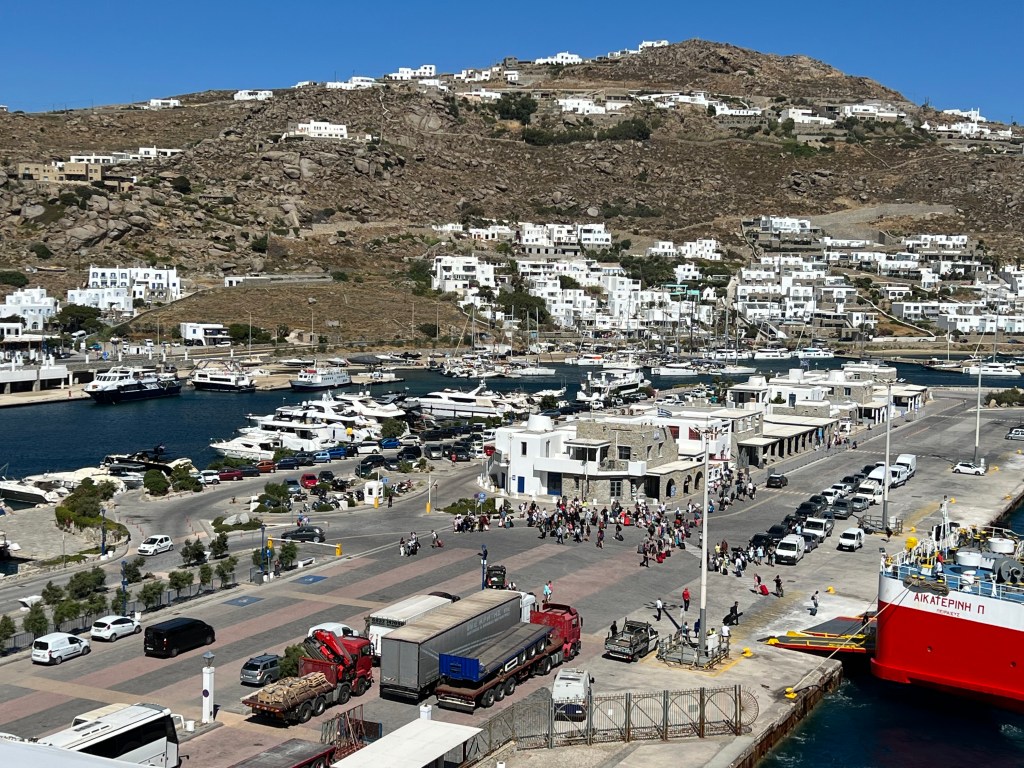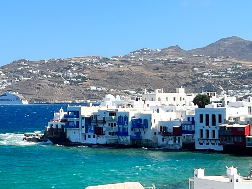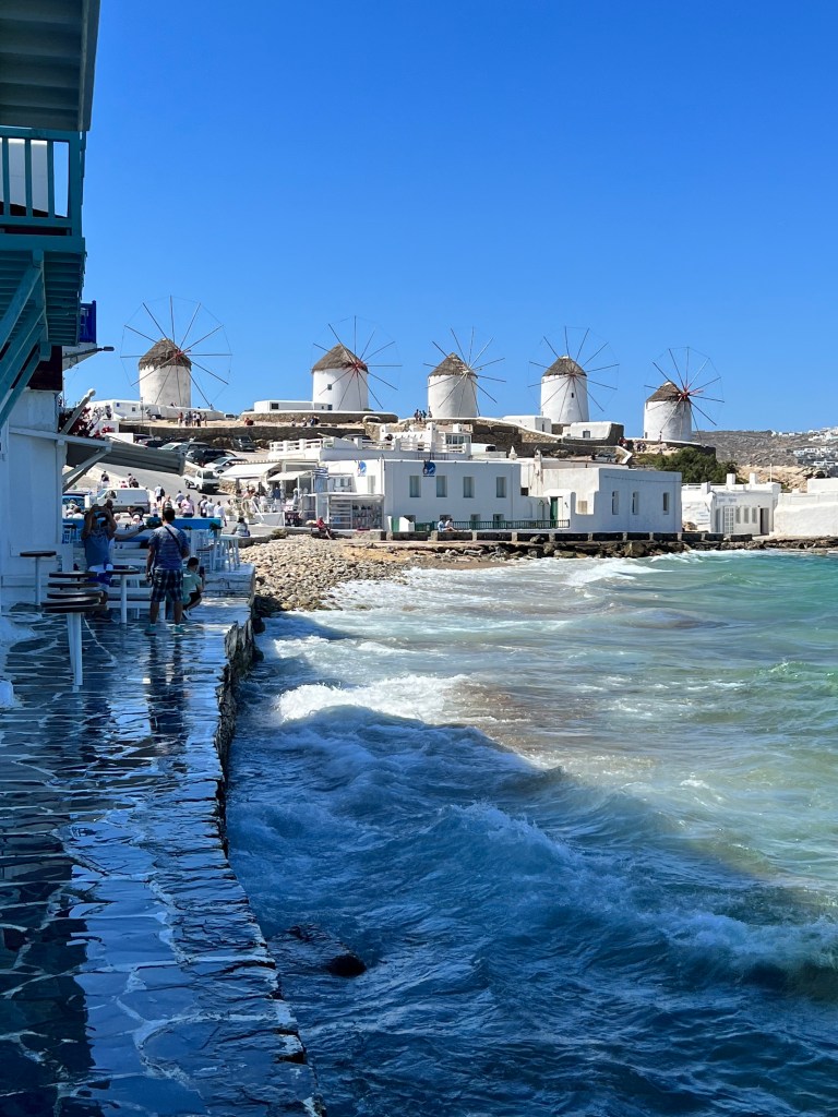Mykonos is Greece’s most famous cosmopolitan island. It is a dry, barren island that gets 300 days of strong winds. We are definitely experiencing strong winds today and loving it. Due to the strong winds this is a very popular location for wind surfers.
