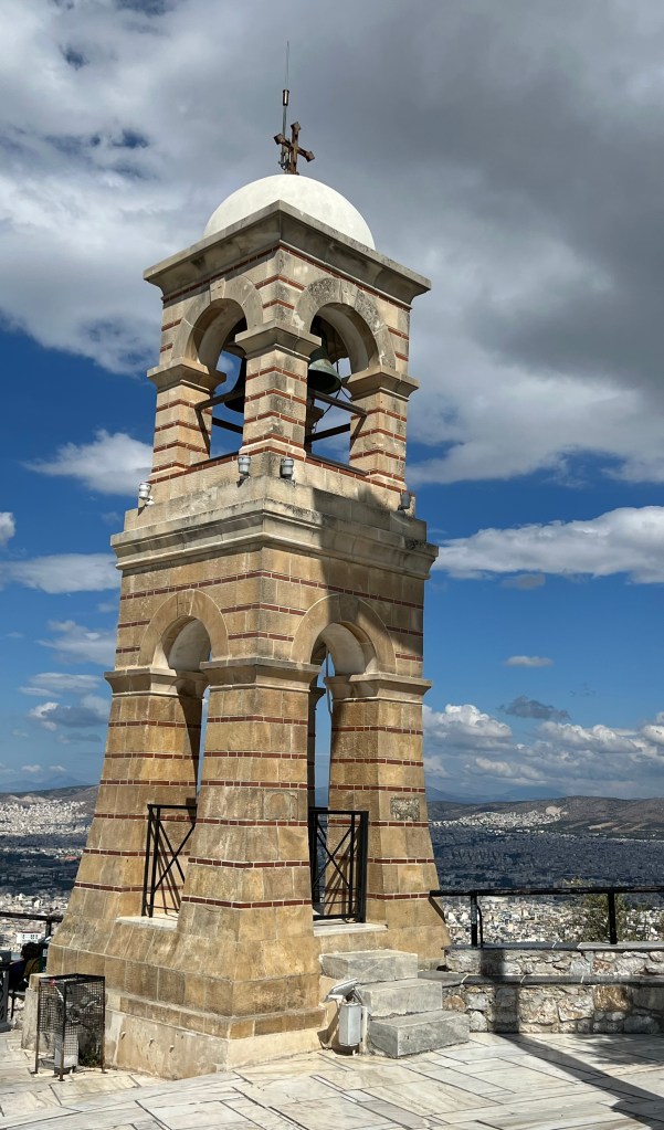 Our next stop was at the most impressive viewpoint of Athens, Lycabettus Hill. Despite its prominence in the city, very little is known about the history of the hill. With a height of 745 ft, Lycabettus is the tallest hill in the capital, offering a panoramic view of almost the entire city. A cable car whisks us up to the highest point in the city. As we ascend the final stairs to the top, we hear mass being broadcast from the little chapel and the aroma of incense tantalizes the senses as the astounding view opens up before us. Our timing is perfect as we arrive during Mass at the Chapel of Saint George which sits atop the hill and was founded in 1834. The church is very small and crowded, so it is quite nice that we can enjoy the mass outside via the broadcast while enjoying the magnificent view and refreshing breeze.
